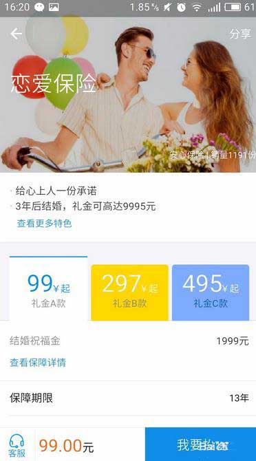 自购买之日起3年以后,13年以后的任意一天,投保人和指定心上人首次领取结婚证后,即可领取结婚祝福金,三个计划可选,祝福金1999元、5997元、及9995元三个计划。(投保3年内领取结婚证则不能获得)