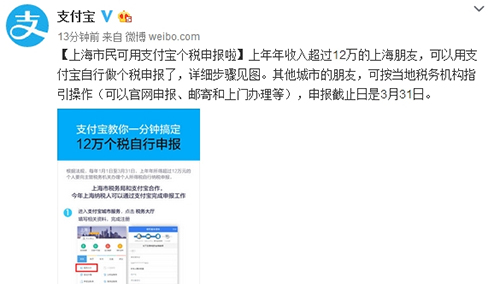 根据法规,每年1月1日至3月31日,在往年年所得超过12万元的个人,都要想主管税务机关办理个人所得税自行纳税申报。如果你在上海,今后就可以足不出户在支付宝上完成啦。