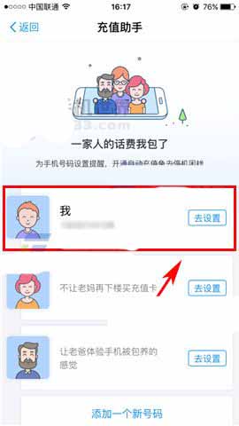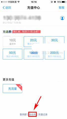 2)点击下方的【自动充】,随后进行选择自己的号码或者设置父母的号码。(如下图)