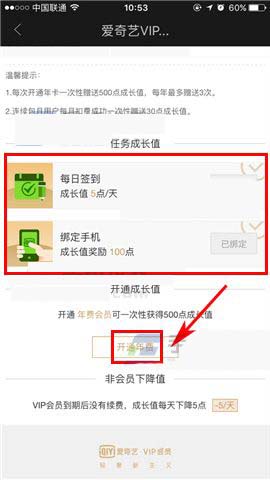 2)打开后我们下拉至任务成长值,随后点击绑定手机即可获取成长值,而只需要每天来此点击【签到】度优惠成长值赠送,最后面就是快速获取更多成长值的时候了,点击【开通年费】,成功购买后即可一次性获得500成长值,以上方法希望会对你们有所帮助哟!(如下图)