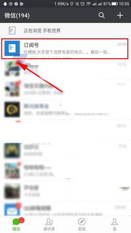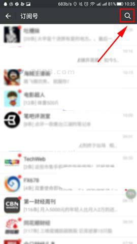 1)我们先打开微信点击进入【订阅号】,进去后再点击右上角的【搜索】。(如下图)