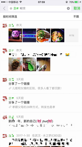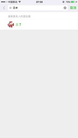 另外通过搜索功能,其实也能定位到具体的某一个微信好友的朋友圈。你只需要在聊天界面点击“朋友圈”,在“搜索朋友圈”搜索框内,选择输入微信好友的昵称,选中。这个好友发布的所有朋友圈你都能搜索到。而且还可以定位到具体哪个年份发送的朋友圈。