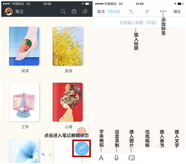 2、进入印记云笔记首页,新改版的笔记本列表风格让人眼前一亮,点击右下角蓝色羽毛笔按钮,即可进入笔记编辑状态,页面上各按钮功能如下图。