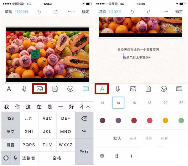3、图文笔记中图片是可以随时插入文字中的。先点击下方图片按钮,选择手机本地相册里的图片,可以选择一张或多张图片。插入图片后,就可以键入文字了,字号和字体、颜色等可以任选。这些格式可以在个人设置里存为笔记默认格式哦。