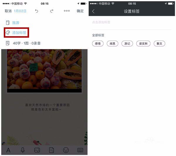 4、在笔记写之前,或写之后,点击界面上方省略号按钮,可以给即将编辑笔记添加笔记本类型和标签类型,都是自定义的哦,满足那颗DIY的心。一篇笔记可以自由打上多个标签,代表不同的时间、地点、人物或心情。然后点击界面左上角箭头返回笔记编辑状态即可。如果你需要控制篇幅,自动显示的字数统计会很方便。