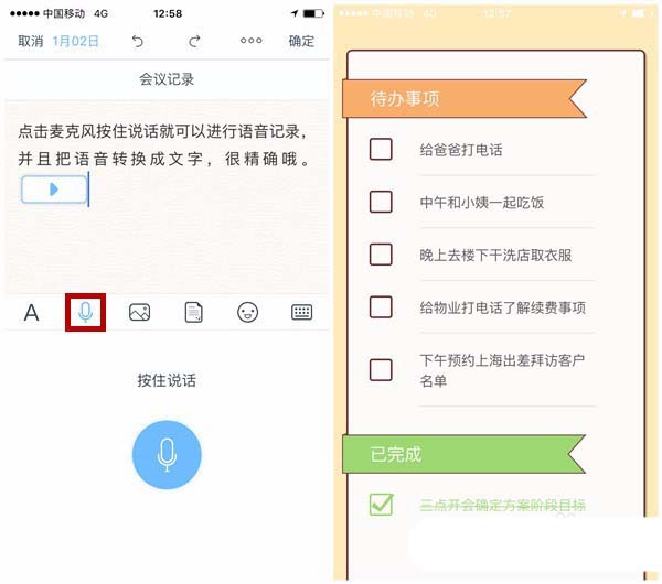 6、除了传统的码字方式,语音录入是印记云笔记的一大特色。点击麦克风按钮说话,松开手后,在联网状态下会自动翻译成文字,比较准确。时间紧急又需要记录的时候(如记录灵感),可以试试。而且新版笔记还增添能选择天气心情的日记、能显示距离重要日子的倒数日、能帮你战胜拖延症的待办清单、能表达心意的卡片四种模式哦!
