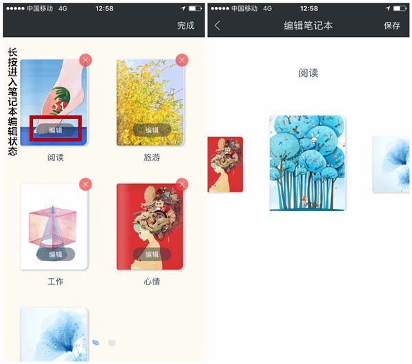 8、最后补充一下,印记云笔记首页支持自定义笔记本种类,可以自定义名称建立笔记本,而且长按笔记本可以进入笔记本封面编辑状态,有很多好看的封面可以选择哦!