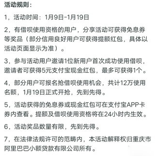有借呗资格的支付宝用户,分享活动可获得免息券等奖品,总计50亿额度。部分信用良好用户可获得提额红包。