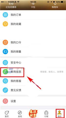 1)打开【飞猪】软件,来到我的页面找到【常用信息】,随后点击【常用发票】。(如下图)