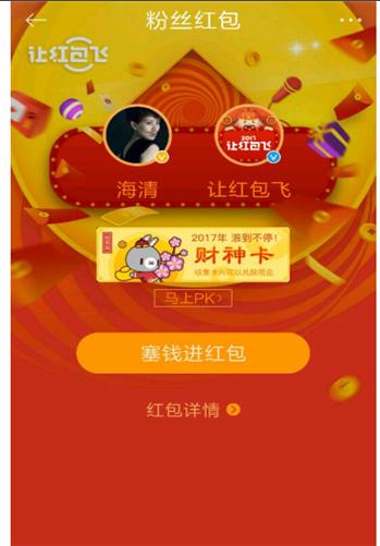 3、进入让红包飞页面后,快去抢红包吧,有些红包里面就有财神卡哦。小编抢了海清的红包,就抢到一张财神卡。
