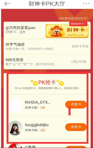 4、除了抢红包获得财神卡,还可以到财神卡PK大厅,和别人PK抢他的卡,想抢谁的卡,这选择“去抢卡”。