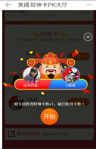 5、进入和别人PK界面,选择开始,如果获胜,你边可以获得一张财神卡,如果失败,你的财神卡则会-1。