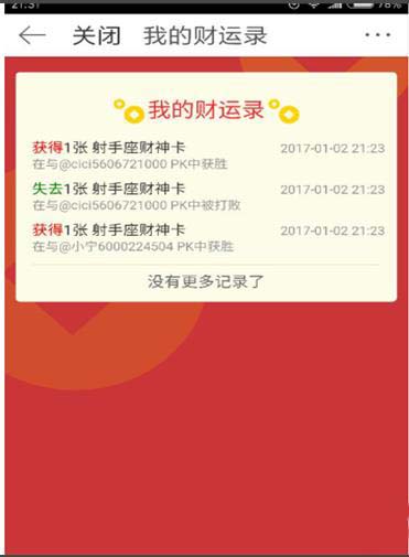 6、你还可以可以选择最下方的“我的财运录”,看一下自己的财运吧,如果财运不错的话,那就去PK抢卡吧。