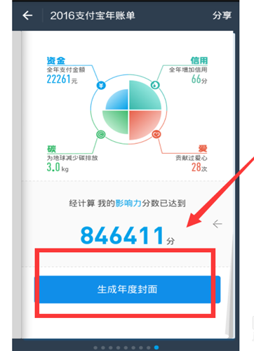 2、你就可以查看你的2016年账单了,2016花了多少钱,献过多少爱心,信用如何,影响力等等,查看完后选择“生成年度封面”,为你的账单生成封面吧。