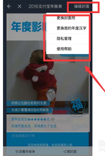 3、支付宝会自动的为你的账单生成封面,如果你对你的封面不太满意,你还可以选择右上角的“编辑封面”,更换封面照,更换年度汉字,进行隐私处理等,设置成功后,你的好友就能看到你的年账单封面了。