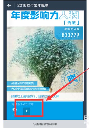6、进入好友的年度影响力人物封面,在封面的最下方有好友祝福她2017年,直接选择后方的“+”。