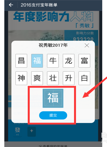 7、会弹出了祝xxx2017年,会有10个寓意比较好的字,你想送那个包含着祝福的字给好友,就直接选择哪个,提交就可以了。