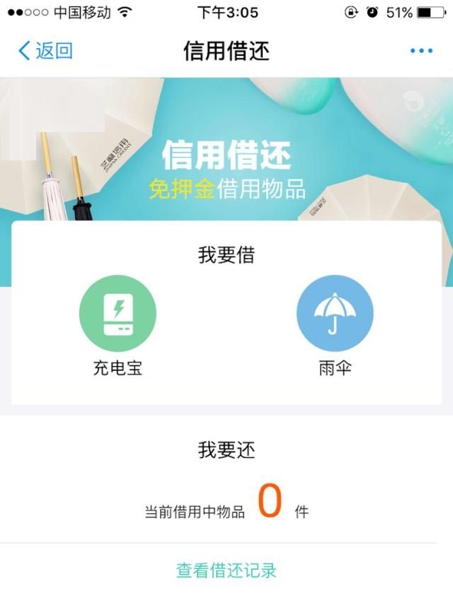 1、打开支付宝平台,进入芝麻信用借还界面,就能看到我要借雨伞的字样,点击雨伞图标即可租借雨伞。