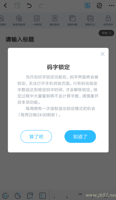 2、打开码字界面之后,点击右上角的按钮唤起菜单列表,在里面的“码字锁定”功能就是所谓的小黑屋模式了。