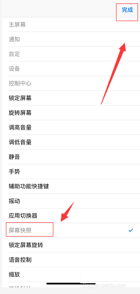 在功能列表中选择屏幕快照,这样屏幕快照就放到了辅助触控的小白点中了,如下图所示