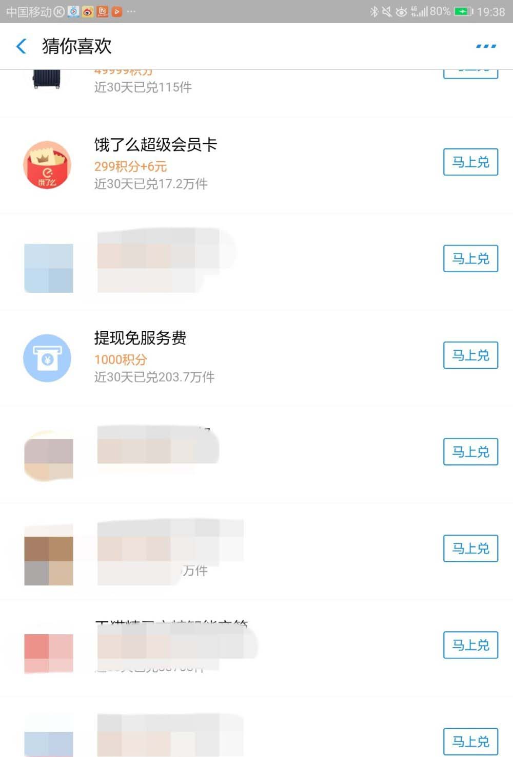 5、接着,在“猜你喜欢”页面中,一直向下翻,找到并点击“饿了么超级会员卡”,点击其后的“马上兑”。