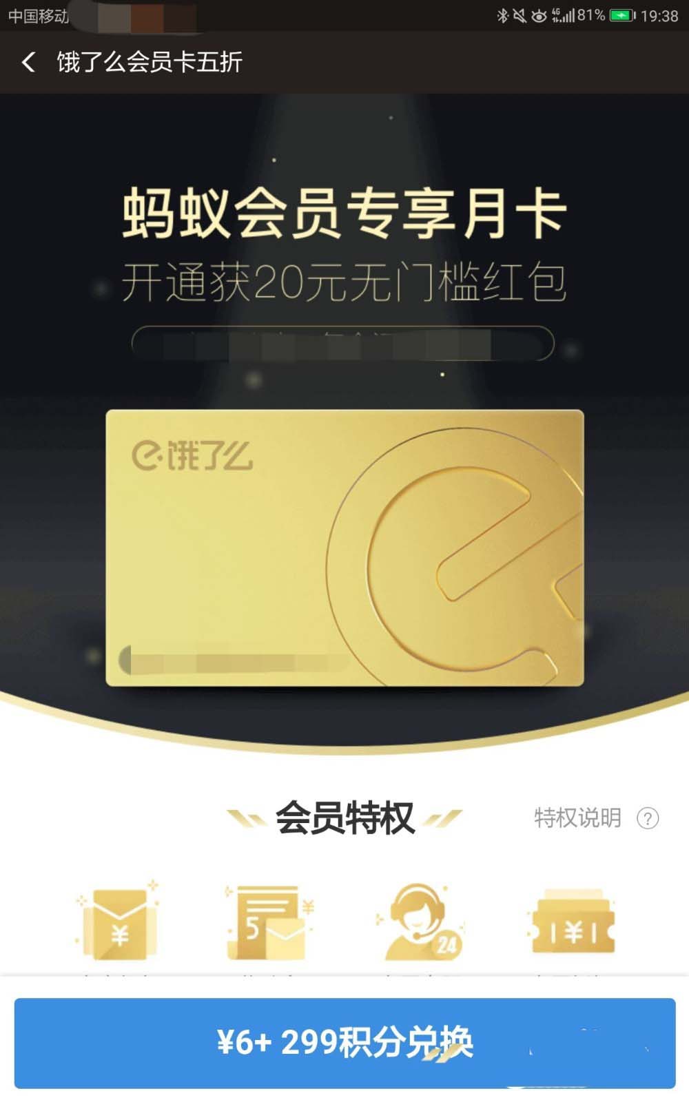 6、最后,在“饿了么会员卡五折”页面,点击下方蓝色框中的“6+299积分兑换”。