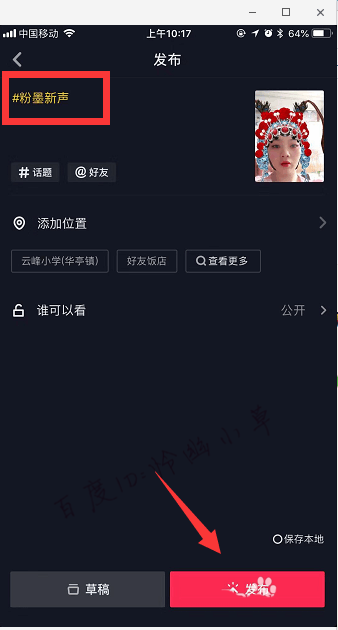 7、拍完会自动参与粉黑新声话题,可再写下标题“发布”。