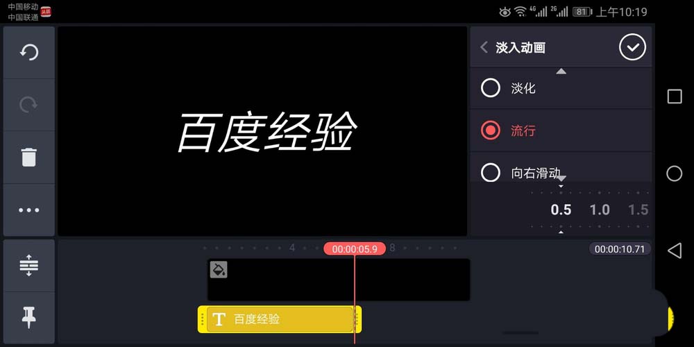3、选择文字内容轨道,淡入动画,选择自己喜欢的一种形式,这里选择流行,设计为0.5,点击确认。