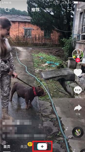 1、这个特效的视频拍摄还是非常简单的,只需在抖音中即可完成,打开抖音并点击【+】。