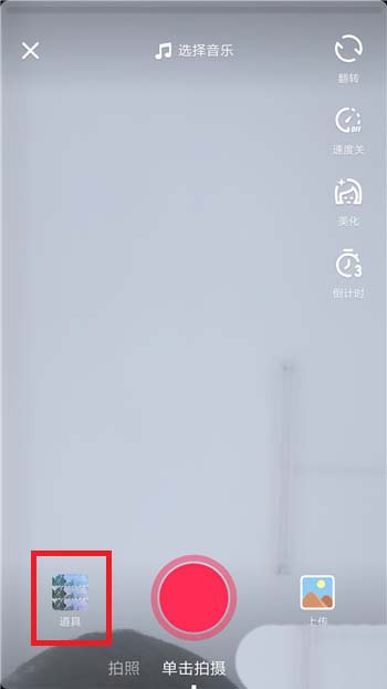 2、在录制界面中需要借助抖音的道具特效拍摄,点击左下角【道具】选项。