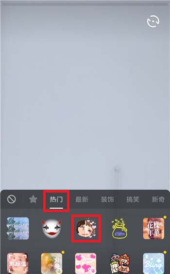 3、打开道具后我们找到【热门】,在下方找到两个半边脸的特效道具,如图所示,点击这个道具。