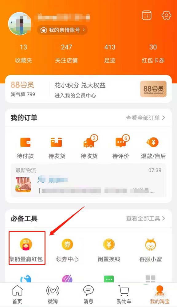 2、然后,点击进入到我的淘宝页面中,点击里面的【集能量赢红包】菜单选项