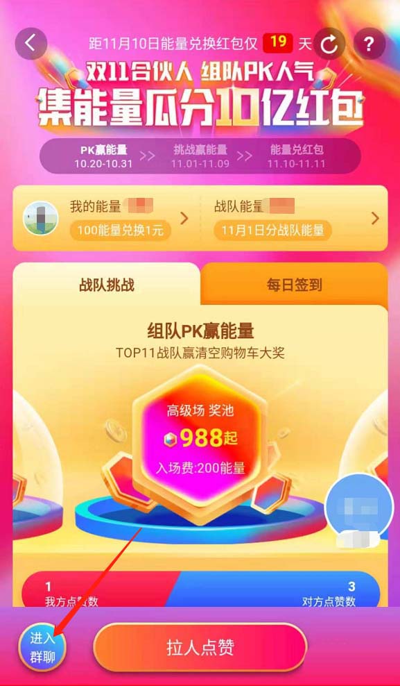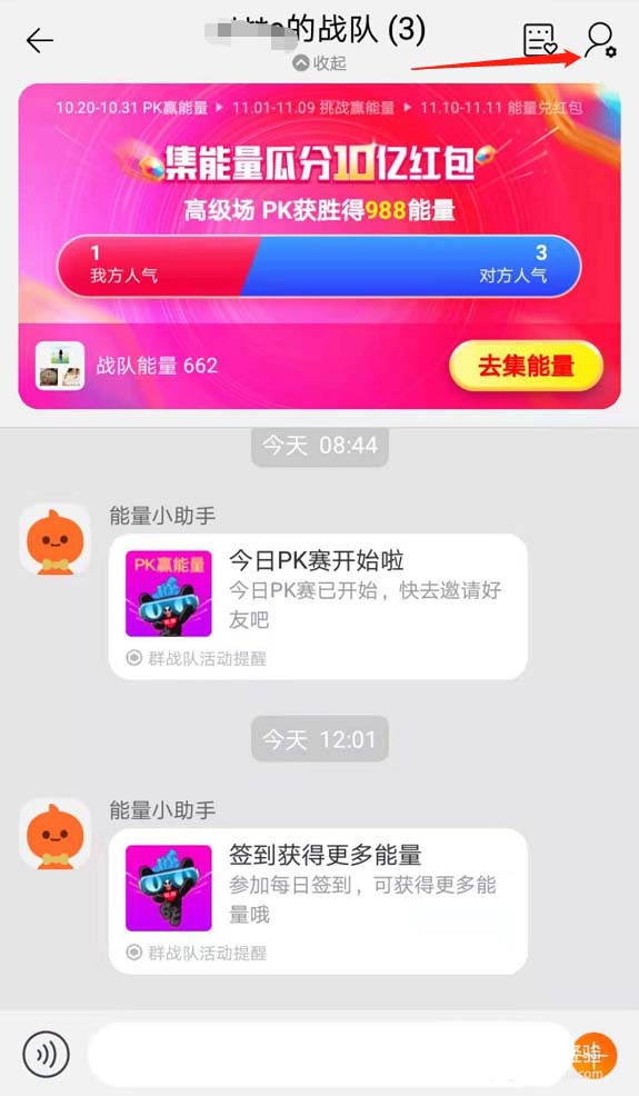 4、进入到群聊页面后,可以看到当前的组队能量,点击右上角的图标