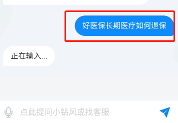 3、如图在在线服务下方输入框中输入“好医保医疗如何退保”并发送,随后如图系统会回复健康险保单查询,如图点击“点击选择交易”。