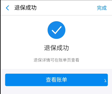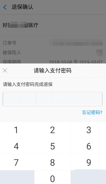 5、如图在退保确认界面点击“确认退保”,随后输入支付密码,接下来会显示退保成功,我们在账单中可以看到退保成功的账单。