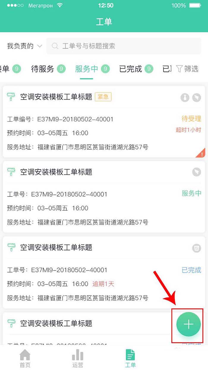 3、进入应用,底部导航切换到工单,点击右下角的+号进行新建工单。