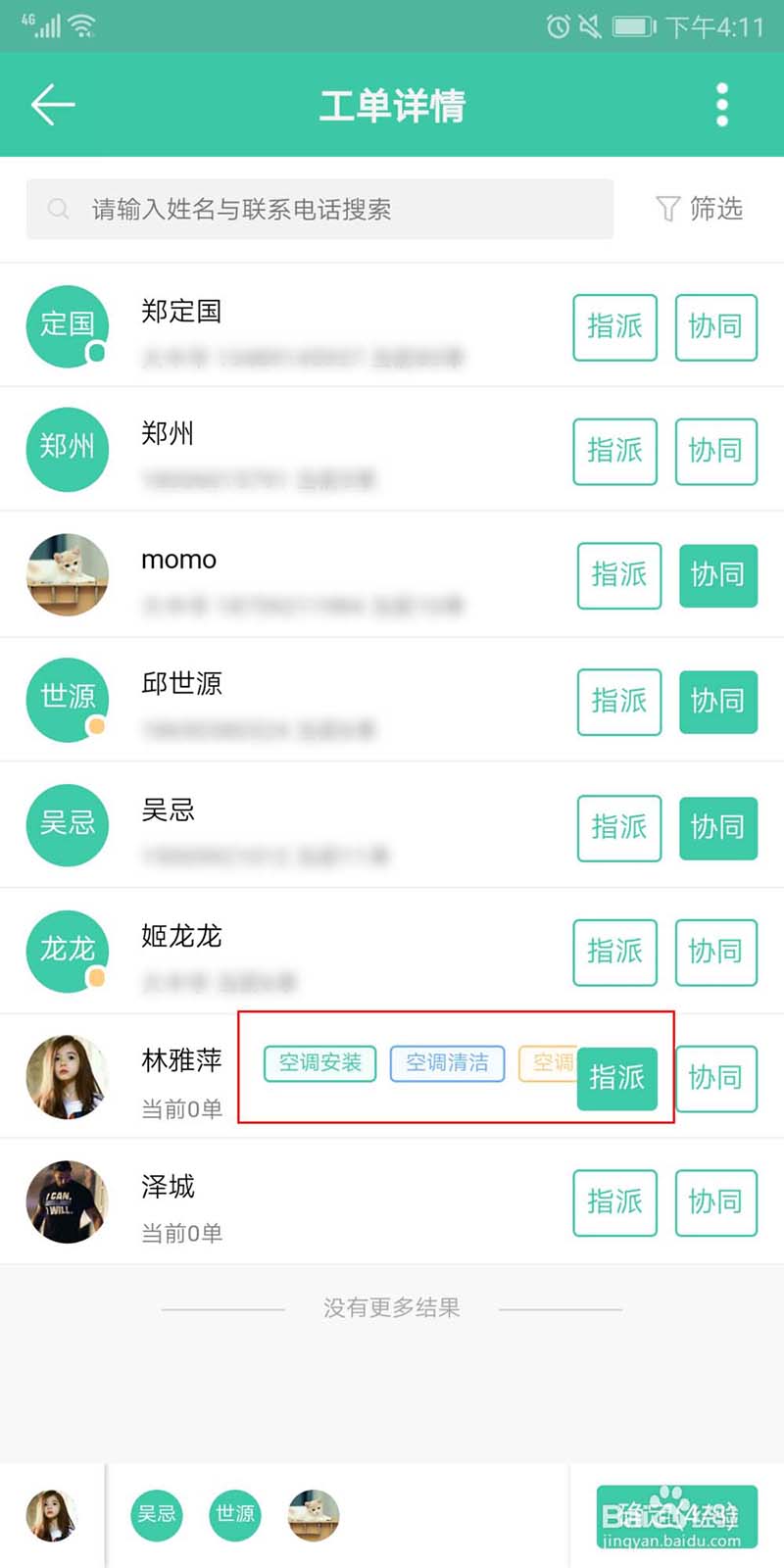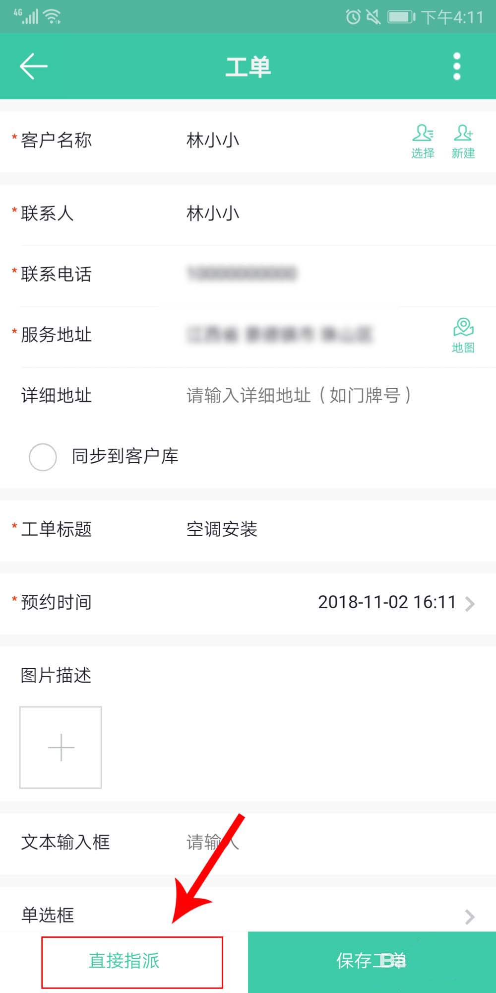 4、填写工单字段后,点击左下角直接指派服务人员,根据技能标签选择有对应技能的服务人员。