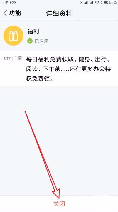 6、在打开的福利详细资料页面中,我们点击下面的“关闭”按钮。
