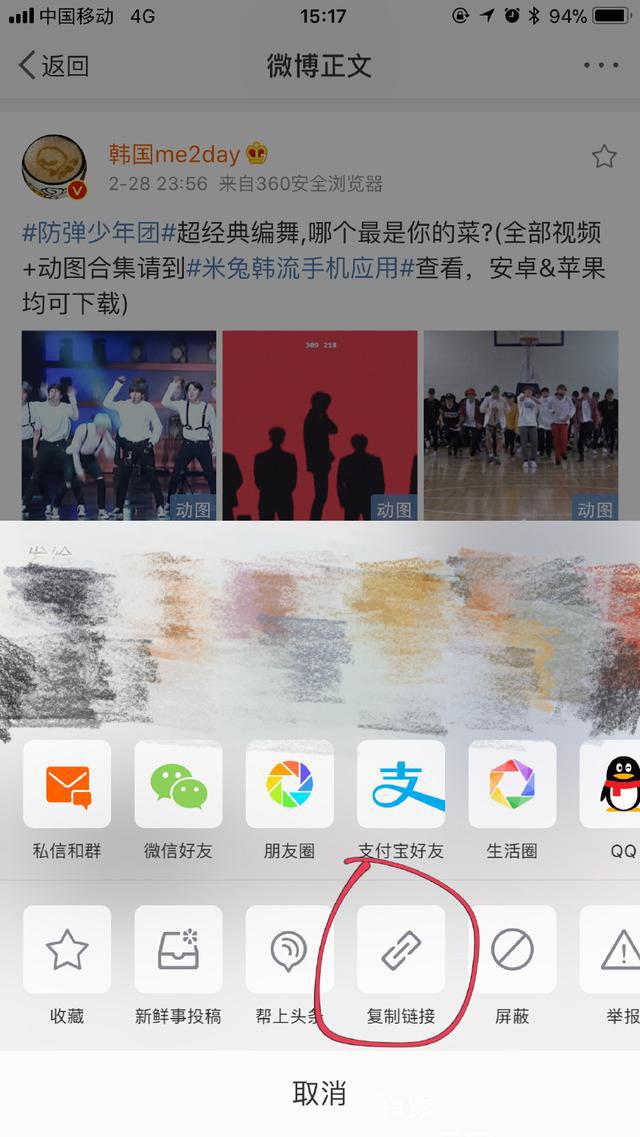 2. 然后先去找到你想要下载的动图,以微博为例,选择【复制链接】。