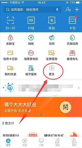 1、打开手机支付宝,在首页,点开更多