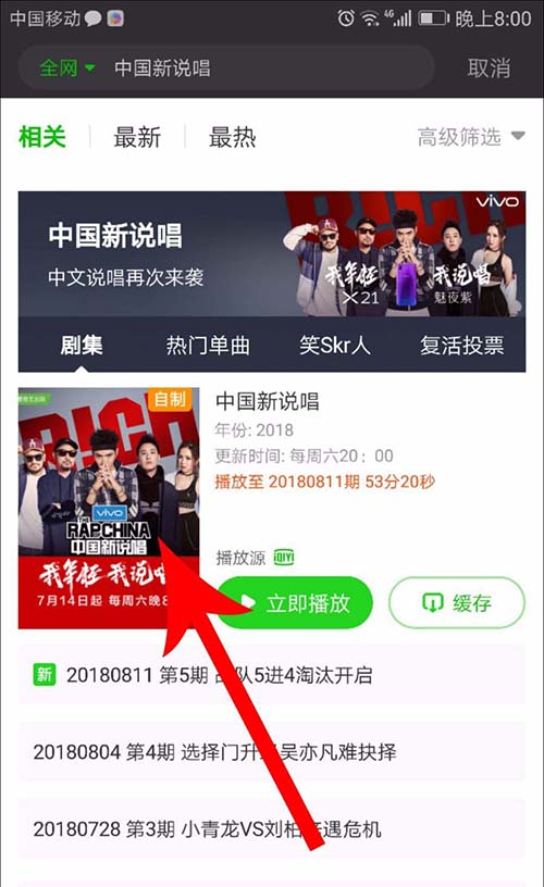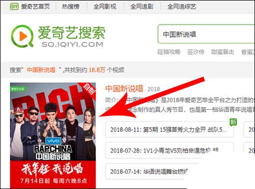 3、这时候我们就可以在爱奇艺网页版中看到中国新说唱了,这时点击箭头所指位置