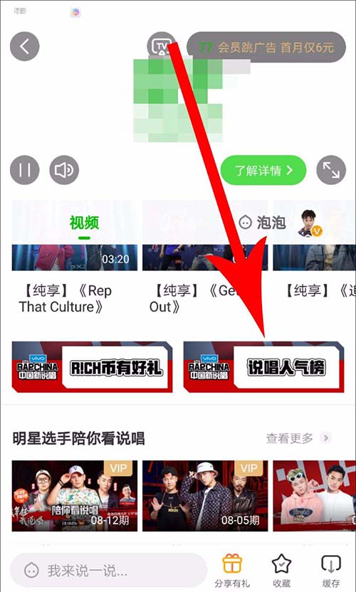 3、此时我们就可以看到中国新说唱最新一期的视频节目了,向下滑动页面,找到“说唱人气榜”并点击