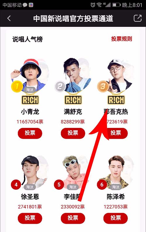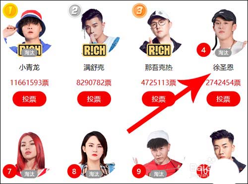 5、来到中国新说唱投票页后,向下滑动页面,就可以看到所有的参赛选手了,有被淘汰的也有没有被淘汰的,以及每位选手当下所得的票数,都可以看到,如果您想要为某位选手投票的时候,点击他的名字位置