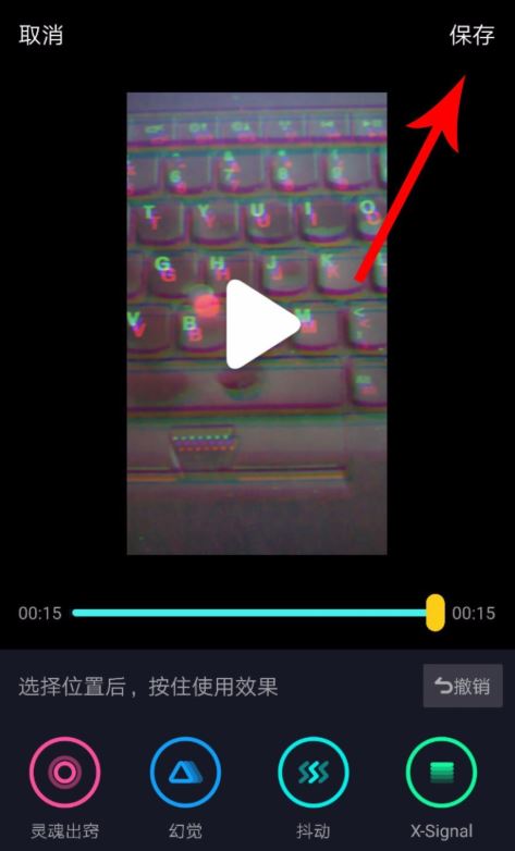 首先,滑动黄色滑块至选定位置,然后点击并一直按住“抖动”特效直到结束位置,同一段视频内可以多次添加特效。完成以上操作后,点击保存。