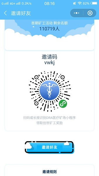 使用手机微信扫一扫扫描上面的小程序分享页面就可以进入DRA医疗矿场了,而且现在dra医疗矿场首期矿工只剩11万名额了,如果不抓紧时间注册,可能以后就得等官方的通知了。