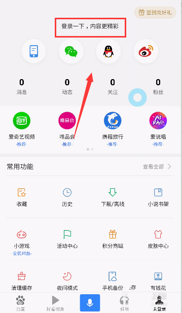 2、进入手机百度后,点击下面的未登录,如下图所示
