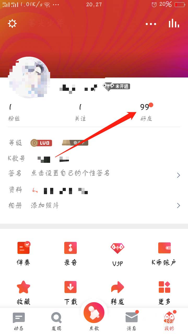 3、登陆进去之后,我们在“我的”页面能看见好友。如果是微信登录就是微信好友里面有玩全民K歌的人,如果是QQ登录也是一样的道理。