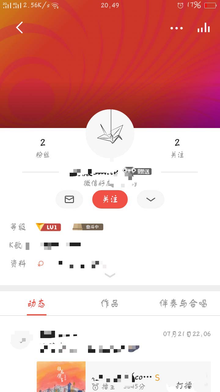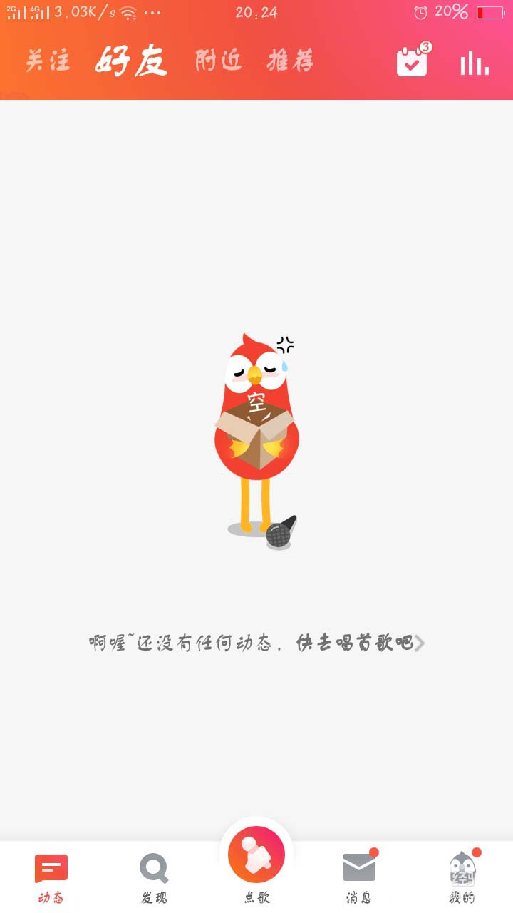 4、想看全民K歌里朋友圈的动态,主要是你的好友动态以及你关注的好友的动态。但是这个动态要在你的微信好友没有屏蔽你或者他唱的歌曲分享出来你才看得到。“好友”页面主要是你的微信好友今天的动态。但是如果今天没有朋友分享,那自然就没有动态了。