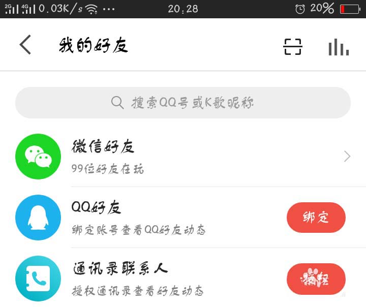 7、如果想增加更加更多的好友,在“我的”页面点击“好友”,就能看到我们既可以绑定微信,也可以同时绑定QQ和通讯录,这样好友的数量也就更多。但是前提是你的微信QQ和通讯录的好友有玩全民K歌。
