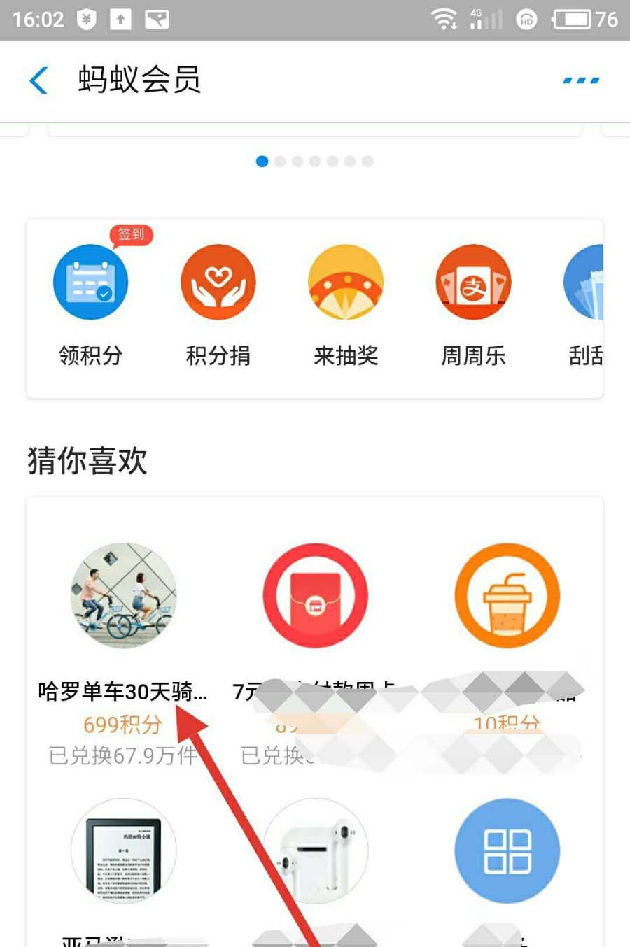 3、进入蚂蚁会员页面后,需要往下拉,才会看到猜你喜欢中的“哈罗单车30天骑行”,点击进入,如下图所示: